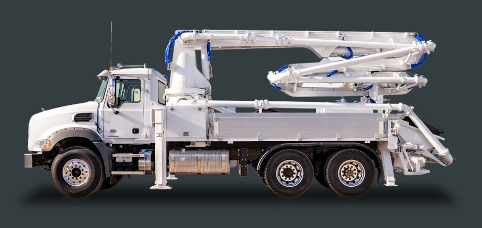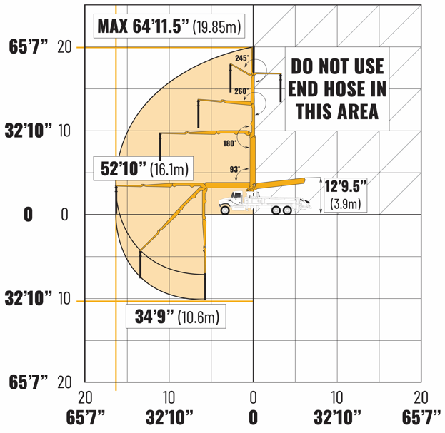 The 20X-4ZR construction concrete boom pump features a maximum horizontal reach of 52’ 10” with a vertical reach of 64’ 11.5”. This truck-mounted four-section Z-roll-fold boom offers a reach capacity of 41’ 4” from the front of the vehicle, making it ideal for tight residential and commercial job sites. The boom’s reach depth is 34’ 9”, while the total unfolding height required is only 12’ 9.5”, allowing for efficient operation in areas with limited overhead clearance.