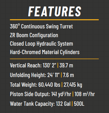 The 40X-5ZR offers a maximum horizontal reach of 117’ 5”. The reach capacity from the front of the vehicle is 107′, while the reach depth is 89’ 9” and the total unfolding height is 24’ 9”. Other specs include an end hose length of 11’ 6” and a hose diameter of 5”, a hydraulic system pressure of 5,075 psi and a material cylinder diameter of 9”.