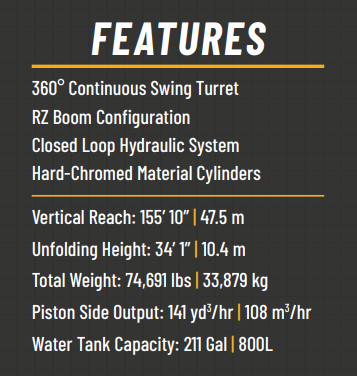 The 48X-5RZ weighs approximately 74,000 lbs. and is equipped with a 211-gallon water tank. The concrete boom’s reach from the front of the vehicle is 133’ 5”, the reach depth equals 111’ 11” and the boom unfolding height is 34’ 1”. The five-section concrete boom pump features the following length breakdown: