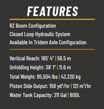 The RZ 57-meter concrete boom pump is our longest reaching and most productive pump for medium to large commercial construction projects. The 57X-6RZ features a six section boom that provides exceptional maneuverability compared to other 57-meter boom pumps on the market today. This design allows operators to work efficiently in congested job sites while still achieving the reach required for large scale construction.