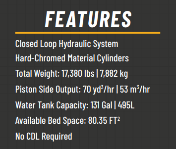 What Are the Features of the CTY-100 Concrete Line Pump?This concrete line pump is a 9,000 lb. pump that measures 27’ 11” x 8’ 5” x 6’ 8”. Its hopper can hold 14.1 cubic feet of material. It features a 45-gallon hydraulic tank, a 150-gallon water tank and a 22-gallon fuel tank. The